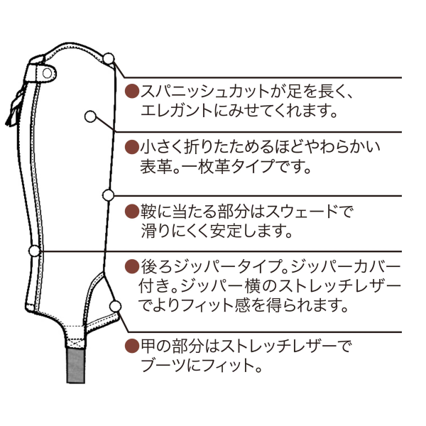 ・ジッパー横のストレッチレザーでよりフィット感を得られます。