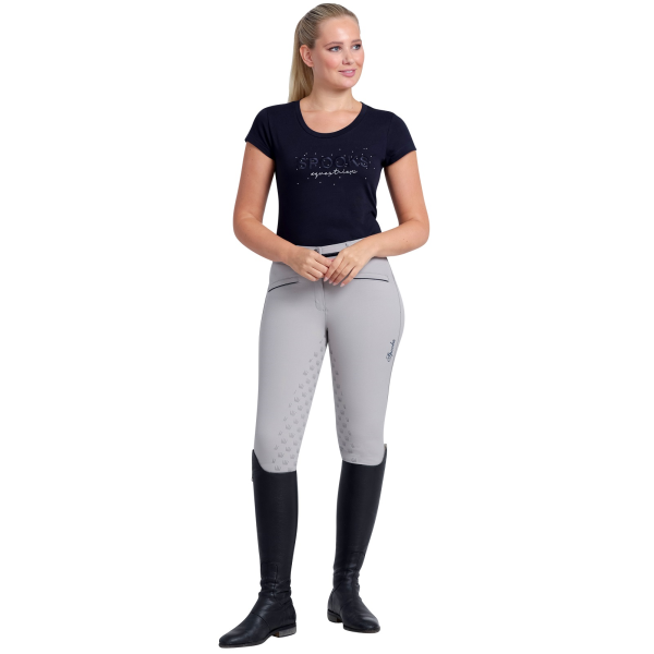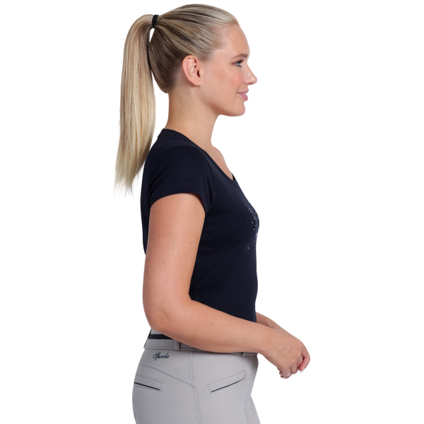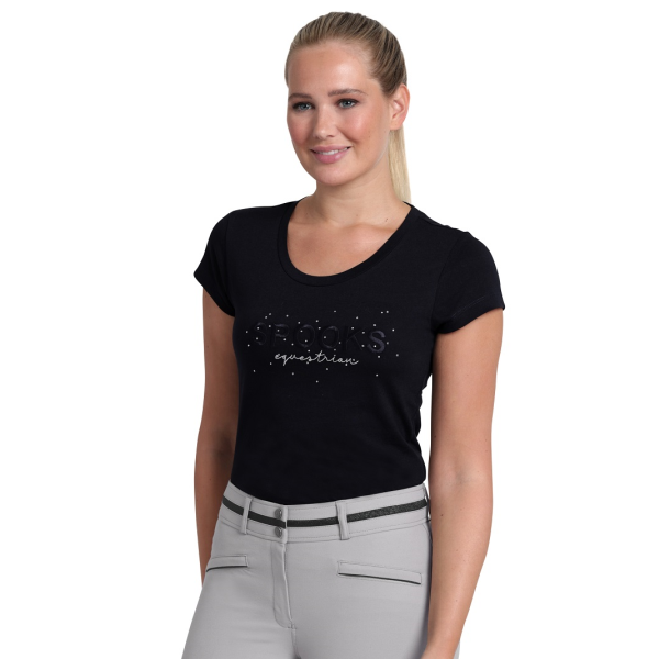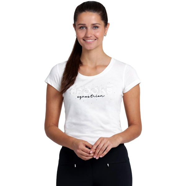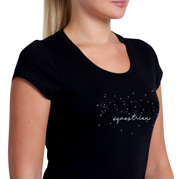 エレガントなSPOOKSのロゴ刺繍とラインストーンが特徴的なTシャツです。