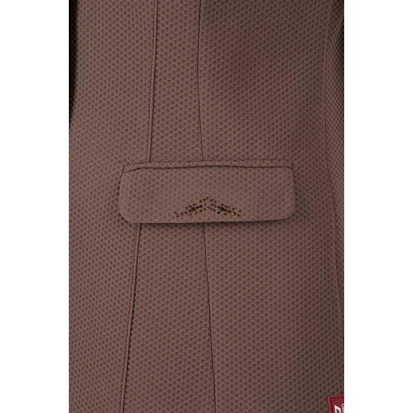 襟とフェイクポケットには生地と同系色のクリスタルが散りばめられています