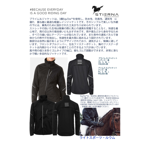 防水性、防風性、通気性を備えたフルストレッチ3層ポリエステル生地EquTex使用の軽量なジャケットです。
